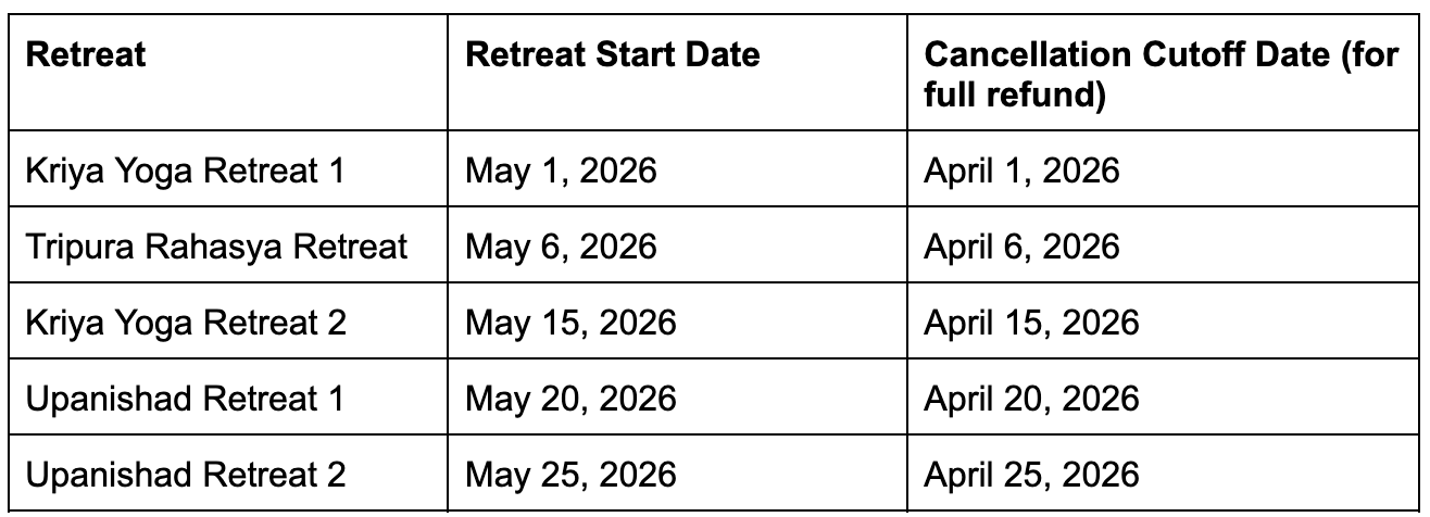 Registration against cancellations reopens on a set date after the cancellation cutoff has passed. The number of available spots equals the number of cancellations received for that retreat.