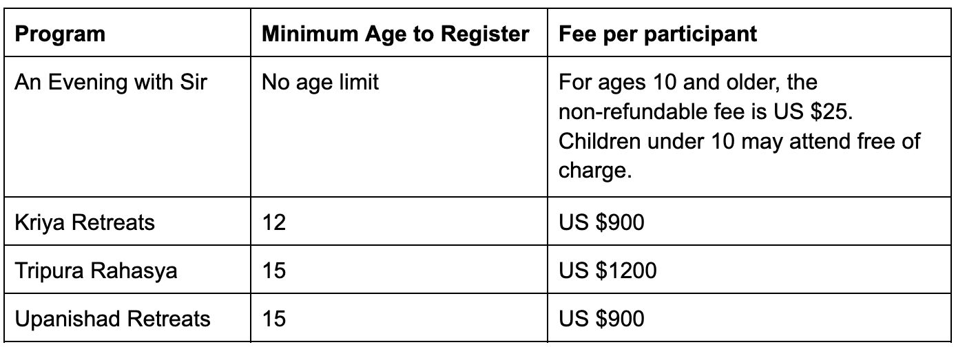 The retreat fee is the same for all registered participants who meet the eligibility criteria. Anyone attending the retreat as a participant, including children who are eligible to register, is required to pay the full retreat fee. For An Evening with Sir, children under 10 years of age attend free of charge.