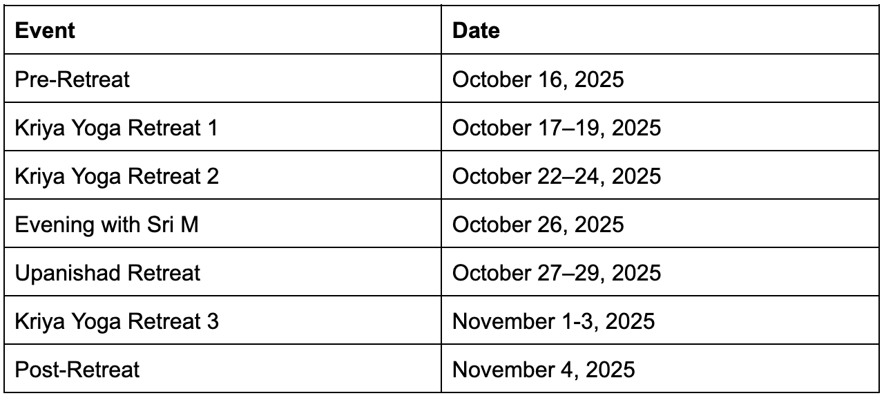 Spiritual Enrichment: Opportunities to join select sessions (group meditation, cultural programs with Sri M, offer pranams and receive blessings from Sri M during the closing session; details at orientation).
